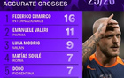 本赛季意甲迪马尔科16次精准传中第一,莫德里奇9次排名第三
